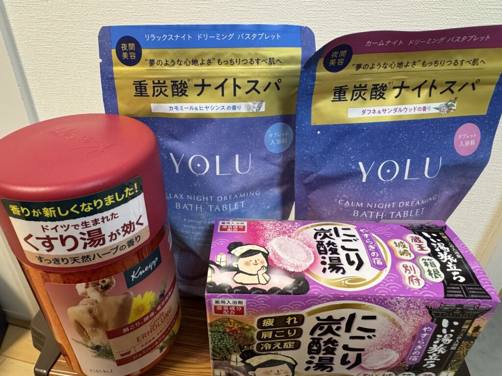 後は色んなバリエーションが楽しめる白元アースさんの「にごり炭酸湯」には長らくお世話になってますし、王道のクナイプさんのバスソルトも香りと鮮やかな湯色で物凄く癒されます。
